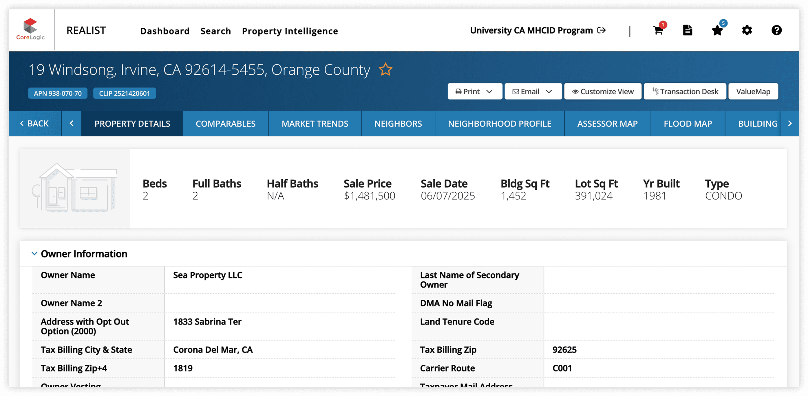 Placed at the top of the property details page, this section brings essential information front and center, reducing time spent scanning. Users can explore specific data via tabs, access original sources, or opt for a premium report, all without breaking their workflow.