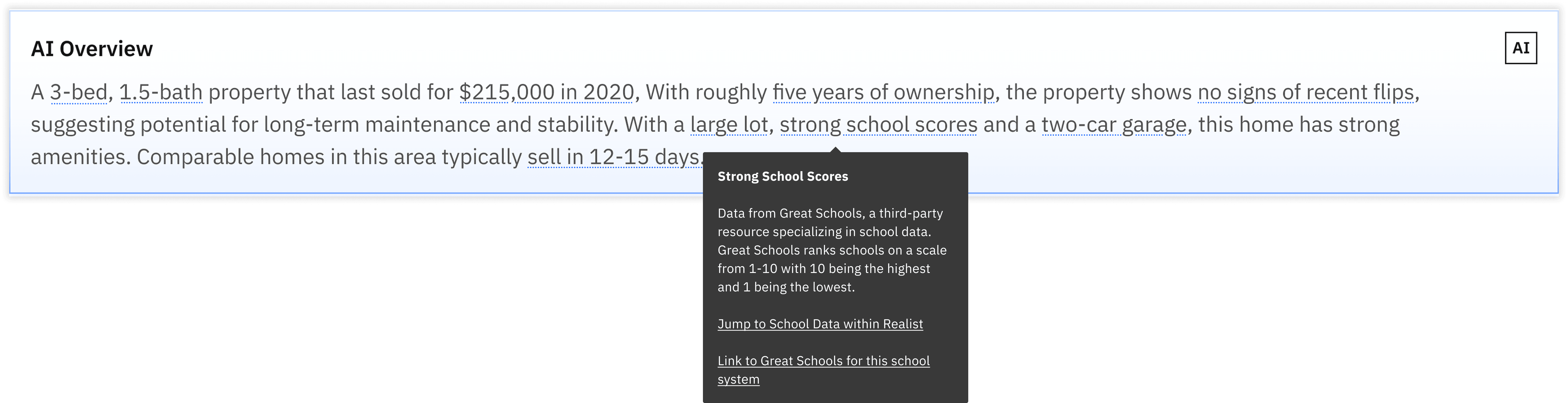 SQL and large language models review and analyze available property data against benchmarks to identify potential red flags. These insights are summarized in natural language, while all specific data points are highlighted and clickable—showing what they mean, how calculations are made, and their original sources.