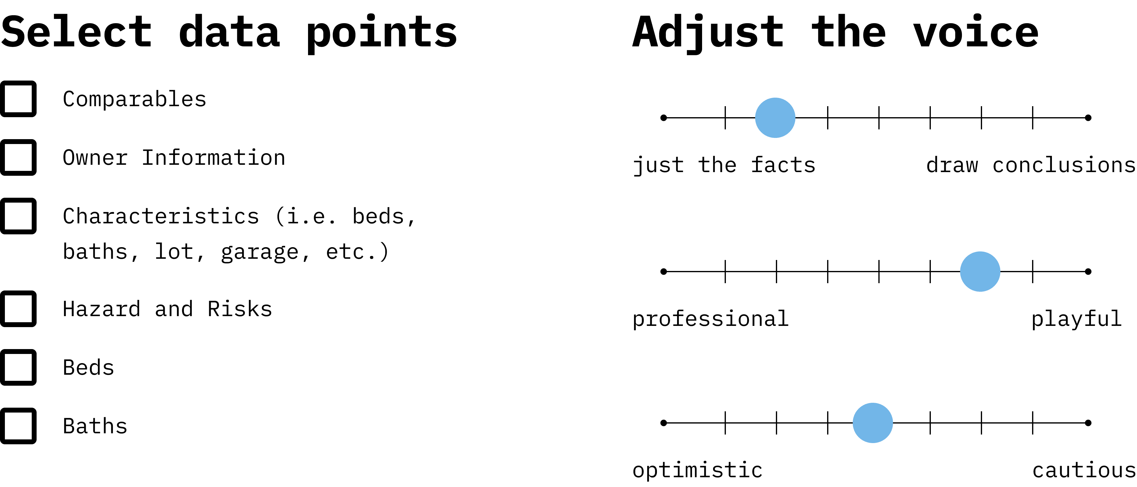 How it works: Introduce the AI Summary with a basic version first, then consider adding features that let users select which datapoints are included and adjust the AI’s voice or subjectivity via a settings screen that applies across all properties, not just individually.