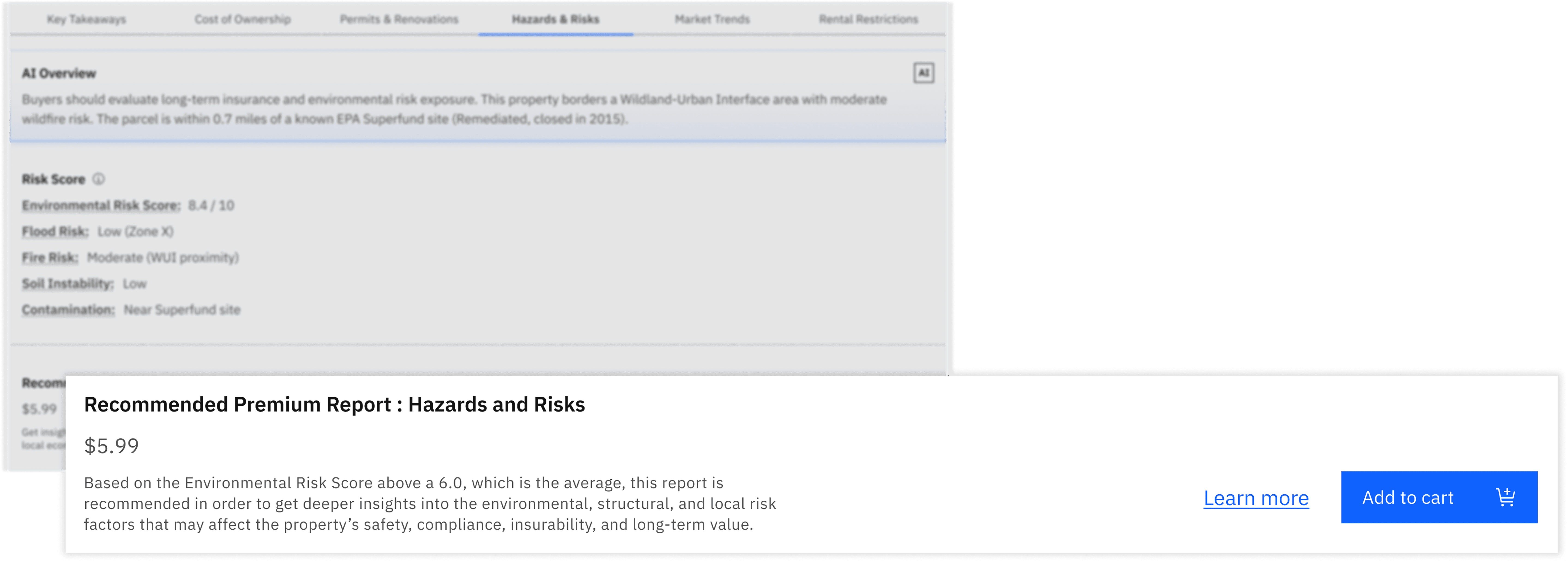 Data Tabs let real estate professionals drill down into specific types of property data, providing more detailed overviews and highlights tailored to their needs. They also enable premium report suggestions, but only when the property data meets specific criteria. Each recommendation includes a clear rationale, so users understand why it’s relevant which helps them feel supported and confident in their workflow rather than pressured to make a purchase.