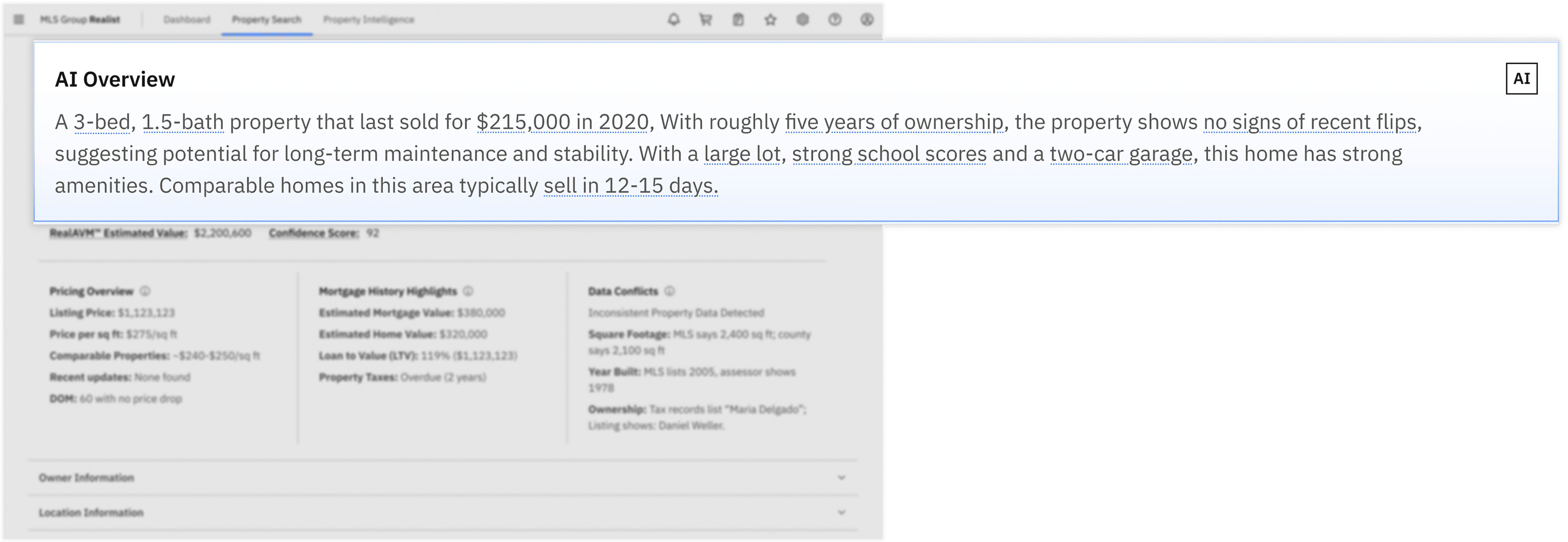 An AI-powered section surfacing critical data and red flags upfront, with natural language summaries and transparent sourcing. Premium reports are suggested in context, making them feel supportive rather than pushy.