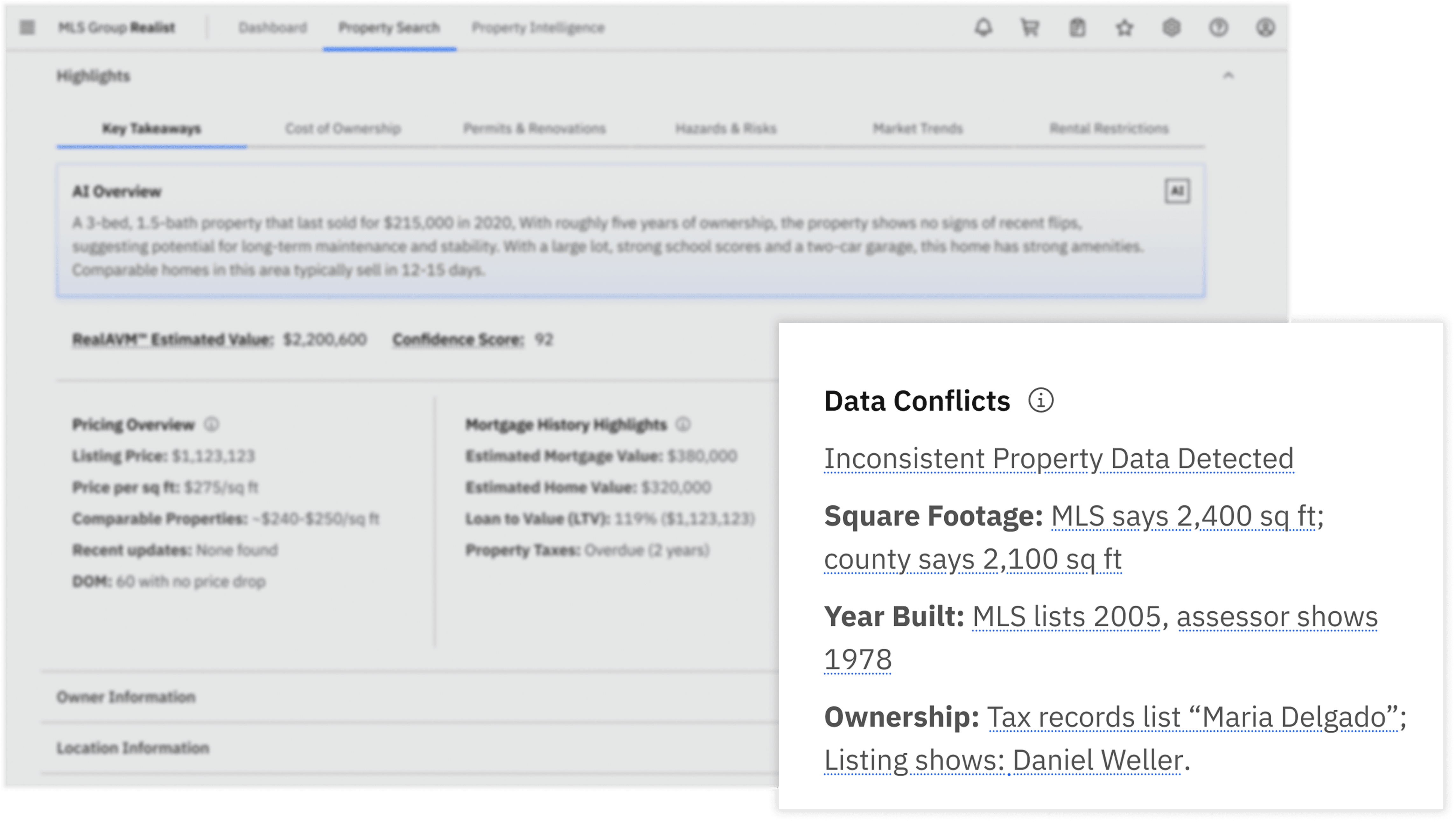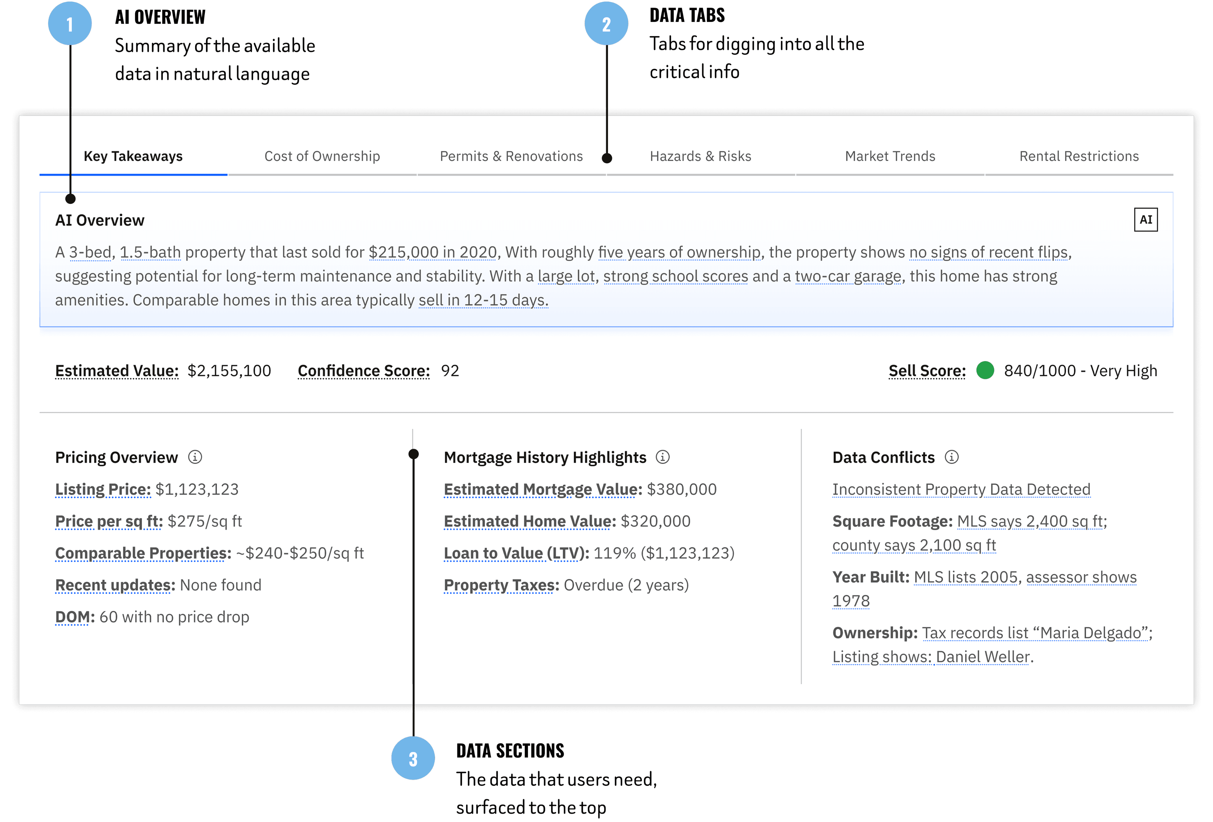 The Data Highlights categories surface the key data that users were already searching for among thousands of points, helping them quickly see what’s important and identify where to dig deeper to understand a property.