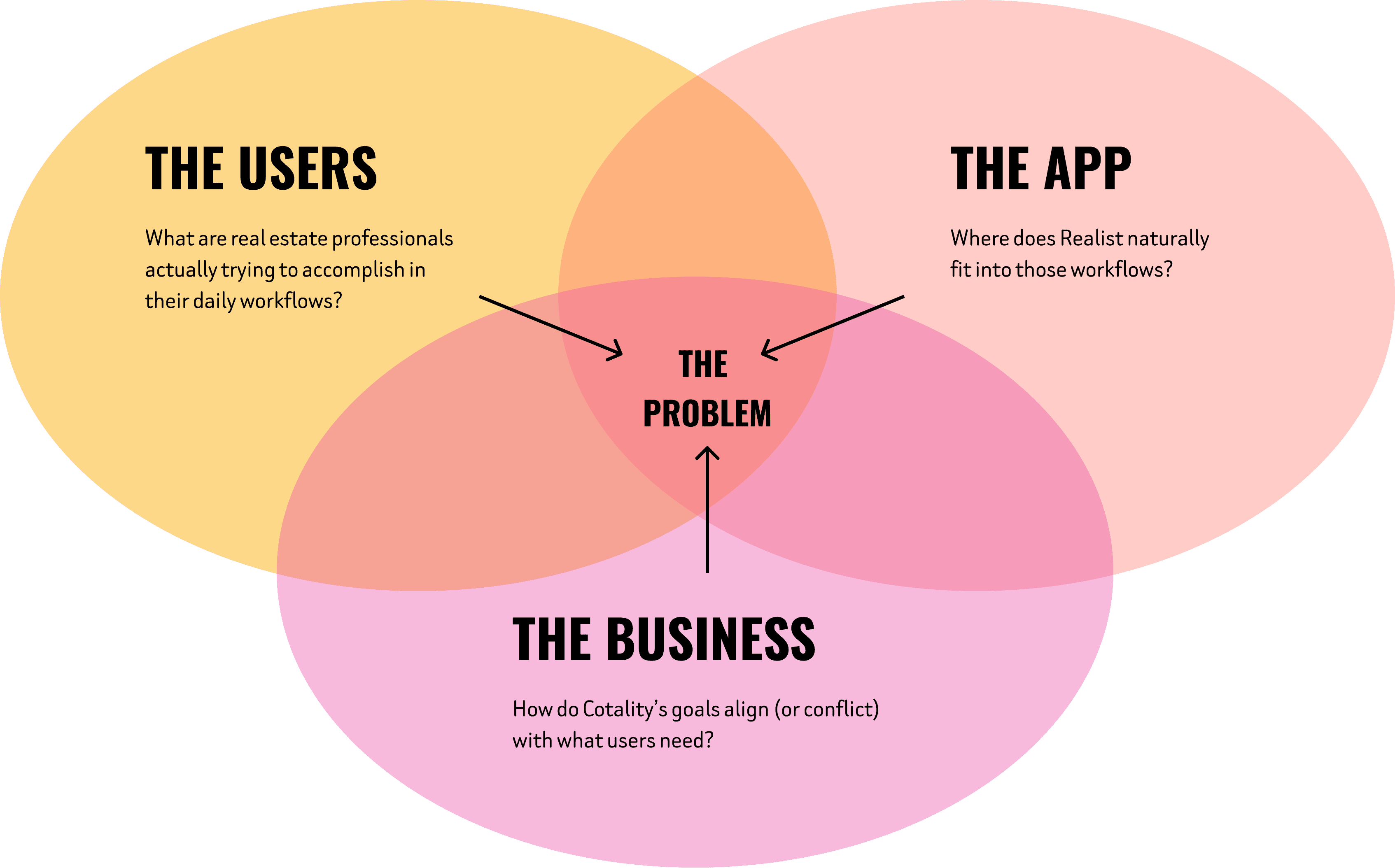 To validate them, I developed a research plan that ensured we examined all three lenses at play: the users, the product itself, and the business. This framework helped me guide the team in keeping our research both actionable for stakeholders and expansive enough to show where Realist fits in the broader market. From there, we were able to define the real problem to tackle in the design phase.